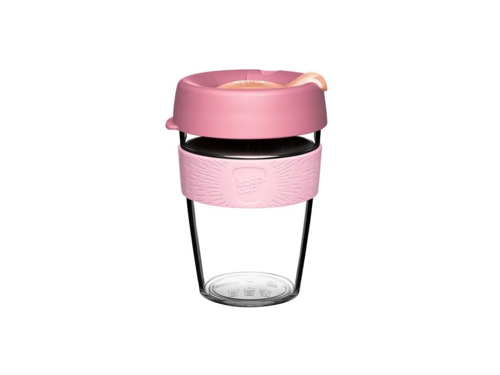 Designový průhledný plastový hrnek s barevným víčkem na kávu, od značky KeepCup, která na svět přivedla první baristický kelímek pro opakované použití (lze samozřejmě použít i na čaj i jiné nápoje).