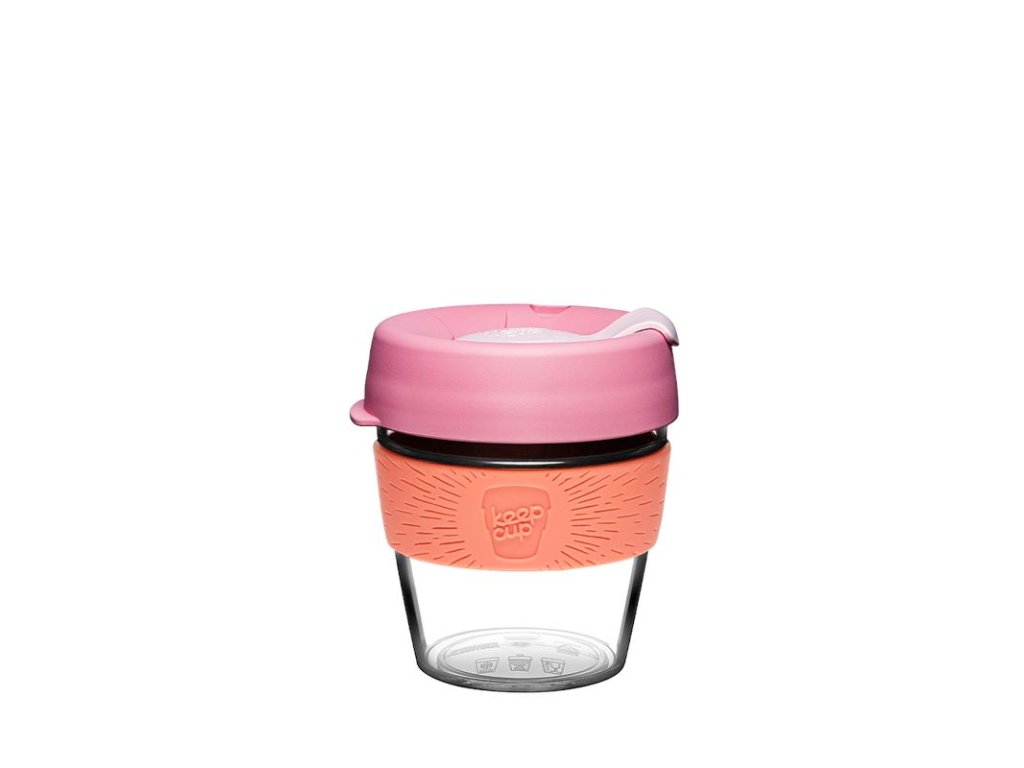 Designový průhledný plastový hrnek s barevným víčkem na kávu, od značky KeepCup, která na svět přivedla první baristický kelímek pro opakované použití (lze samozřejmě použít i na čaj i jiné nápoje).